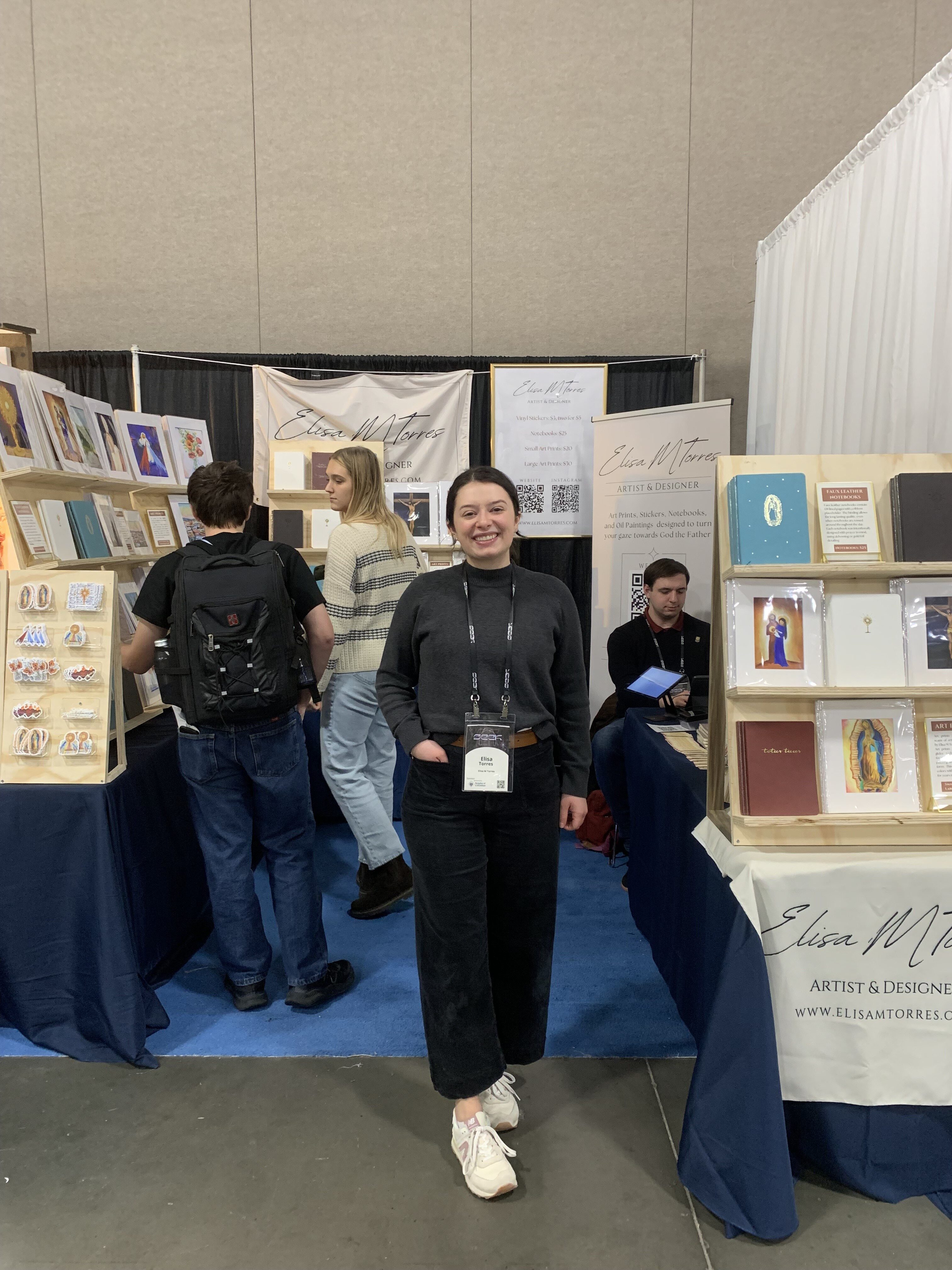After college graduation, Elisa served as a FOCUS Missionary at Stony Brook University on Long Island from 2020-2022. Then, in the summer of 2022, Elisa participated at the GIVEN Forum at Neumann University in Philadelphia, PA. During this period, she wrestled with her internal tension between creating classic oil paintings depicting sacred imagery versus delving into design for everyday products. She elaborates, “My GIVEN action plan had to do with bringing beauty into the world in a more accessible way. I wanted this to be through intentionally Catholic artwork, but was unsure of how that would come to be.” With the guidance from her GIVEN mentor, Sarah Maple, Elisa developed a concrete plan to channel her love of classic art into an approachable tool for evangelization.