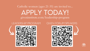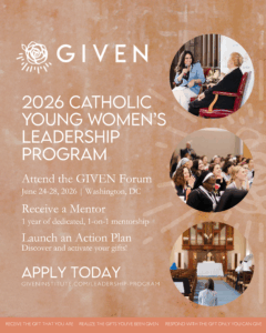 The GIVEN Institute’s Catholic Young Women’s Leadership Program offers leadership development, faith formation, and dedicated mentorship for young women ages 21-35 seeking to live out their unique vocation and mission. Women accepted to the program participate in The Leadership Forum from June 24-28, 2026 at The Catholic University of America in Washington, DC, and are then paired with an established Catholic female leader for 1-on-1 mentorship and support to develop and launch an Action Plan – a new initiative activating personal gifts in service to others. GIVEN is also accepting applications from lay and consecrated women (ages 36+) who would like to serve as mentors or volunteers at the 2026 Forum. All women are encouraged to join GIVEN! To learn more and apply for the 2026 Cohort, please visit: https://giveninstitute.com/leadership-program/ (Applications will be accepted after December 31, as space permits.)